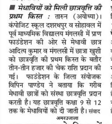 विगत वर्षों की भांति वर्तमान सत्र 2025-26 में कक्षा 8 में जनपद अयोध्या के परिषदीय विद्यालयों में अध्ययनरत छात्र-छात्राओं के उत्साहवर्धन एवं प्रोत्साहन हेतु प्राण फाउंडेशन की सारथी छात्रवृत्ति हेतु आवेदन आमंत्रित किए जाते हैं। आवेदन हेतु आवश्यक योग्यताएं निम्नांकित हैं—
